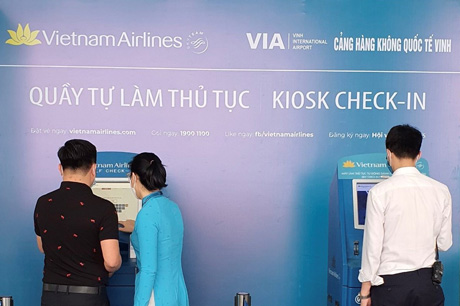 Lần đầu tiên, hành khách xuất phát từ sân bay Vinh có thể tự làm thủ tục bằng kiosk tại sân bay, làm trực tuyến qua website www.vietnamairlines.com hoặc ứng dụng di động.