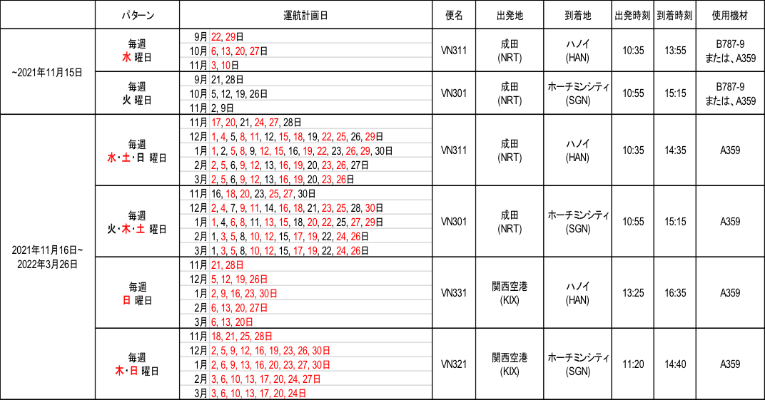 弊社では、新型コロナウイルスの感染拡大に伴う、ベトナム政府によるベトナム着の国際定期商用便の運航制限を受け、9月より 成田–ハノイ/ホーチミンシティ線、11月より関西空港–ハノイ/ホーチミンシティ線において特別便の運航計画を更新しましたのでお知らせいたします。
