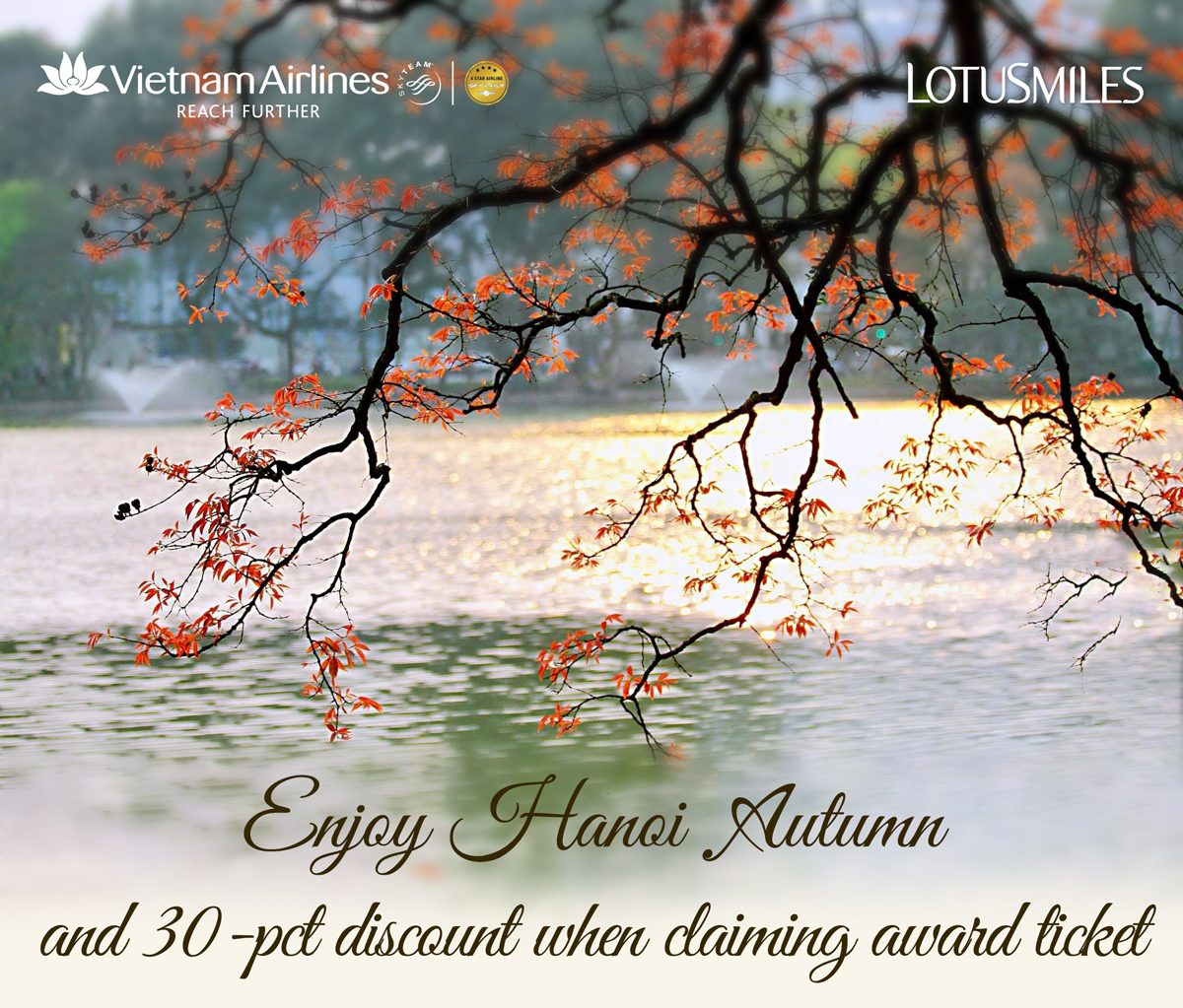 Lotusmiles members are kindly invited to come to Hanoi and enjoy the autumn atmosphere that is spreading throughout the streets and alleys. Furthermore, please enjoy a 30-percent discount when claiming award tickets from now to November 30, 2023 (Flights until March 31, 2024). The incentive is applied for all Lotusmiles members.