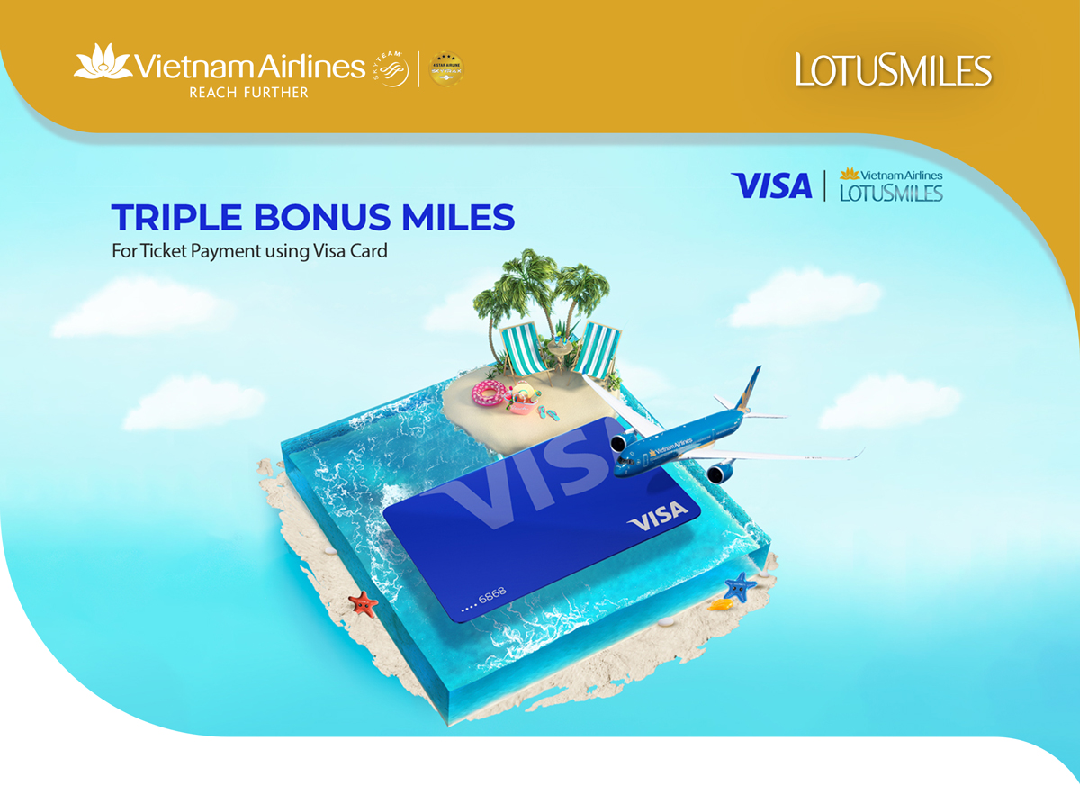 As a Lotusmiles member, you can unlock the opportunity to earn triple bonus miles when buying air tickets at Vietnam Airlines website or its app using Visa card. This exclusive offer applies for traveling between Vietnam and Asia, Australia on Vietnam Airlines flights.