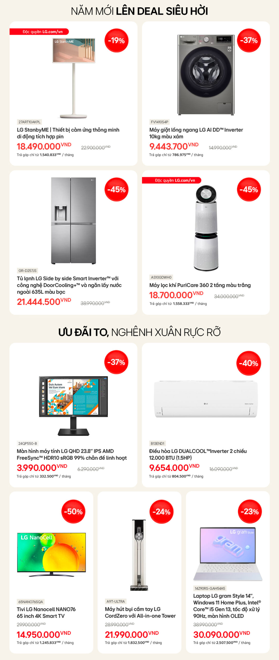 Đón chào năm mới 2024, từ nay đến 31/01/2024, CBNV Vietnam Airlines. được giảm giá đến 50% khi mua các sản phẩm tivi, tủ lạnh, máy lạnh, máy giặt, laptop, màn hình máy tính, loa… và các thiết bị gia dụng tại trang web: https://www.lg.com/vn.