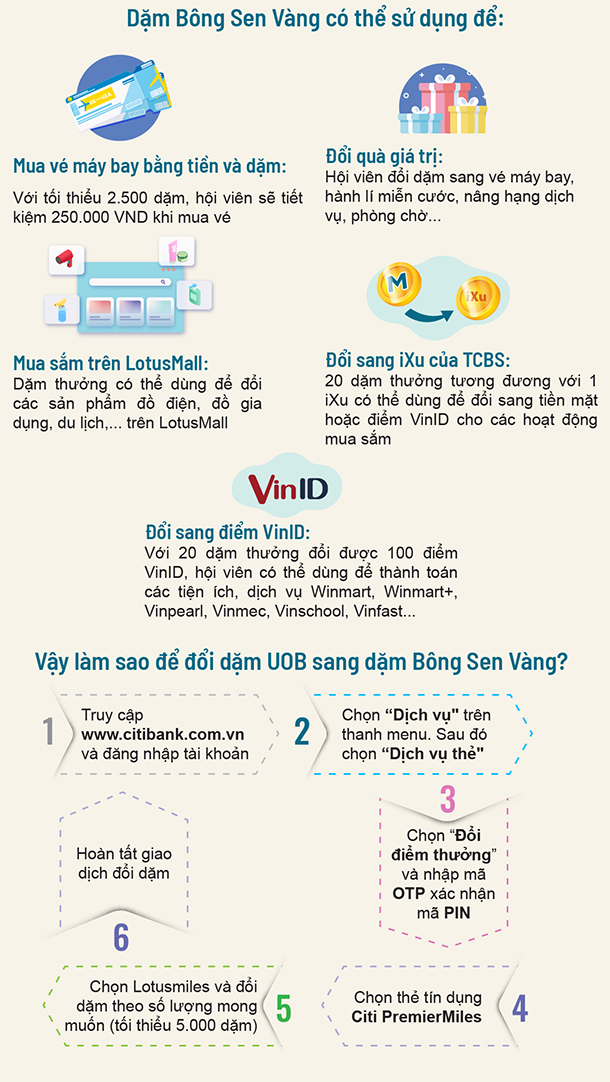 Cảm ơn Quý hội viên đã mở thẻ tín dụng UOB. Hãy khám phá vô vàn ưu đãi đổi thưởng của dặm Bông Sen Vàng và thực hiện các bước sau để đổi dặm UOB sang dặm Bông Sen Vàng nhé.