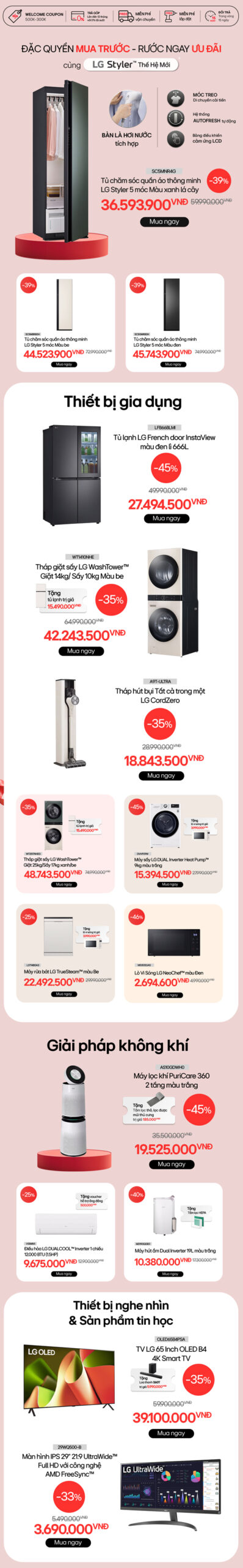 Khách hàng sẽ có cơ hội sở hữu các sản phẩm LG StylerTM thế hệ mới, có nhiều tính năng ưu việt như: tủ chăm sóc quần áo thông minh, tháp giặt sấy, tháp hút bụi, máy rửa bát, máy lọc không khí, máy hút ẩm, điều hòa inverter, tủ lạnh đa năng, ti vi đời mới, các sản phẩm tin học, thiết bị nghe nhìn hiện đại… cùng nhiều đồ gia dụng tiện ích.